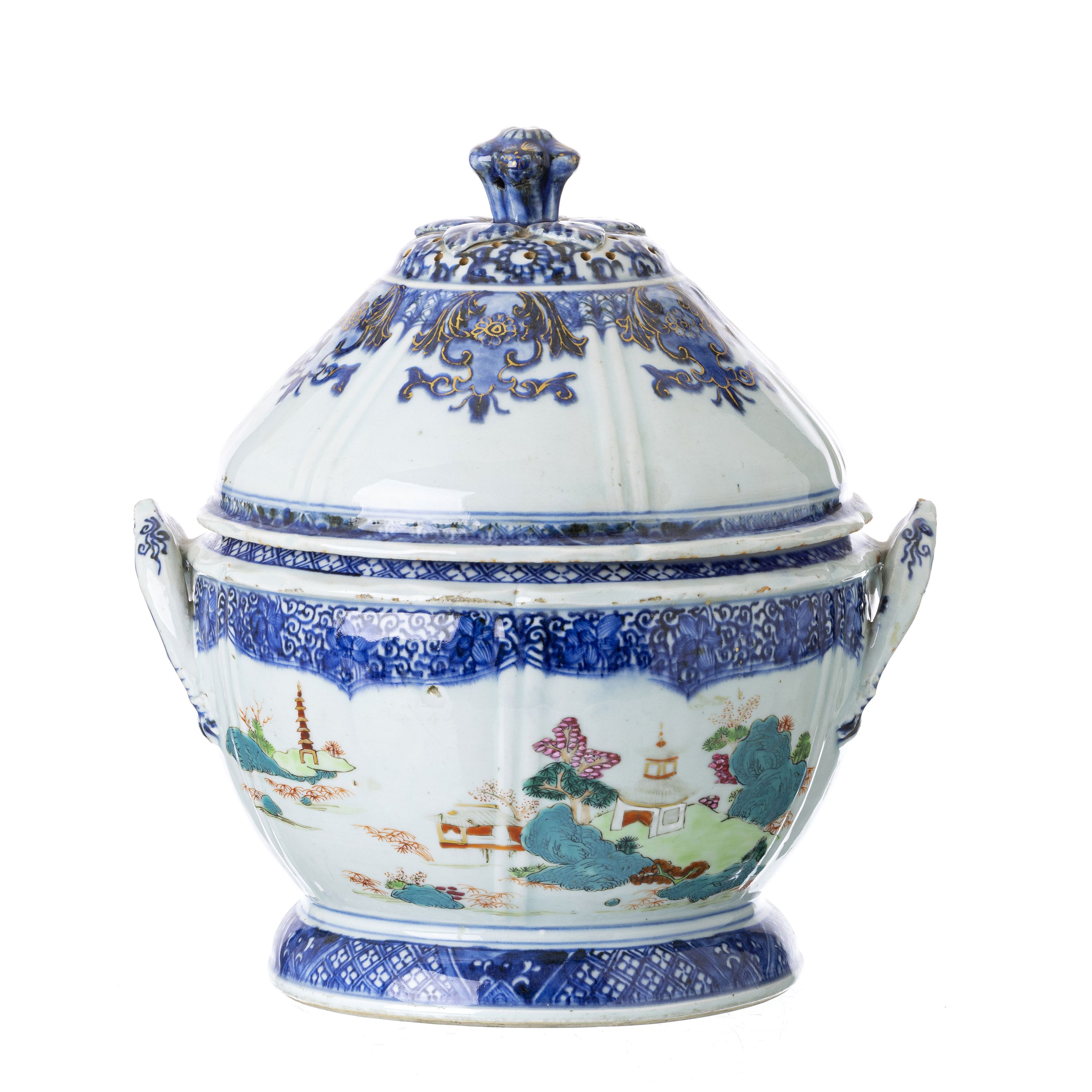 China, Qianlong, decoração policroma e a ouro com paisagens e motivos florais. Pequenos cabelos na tampa. Dim.: 31cm.