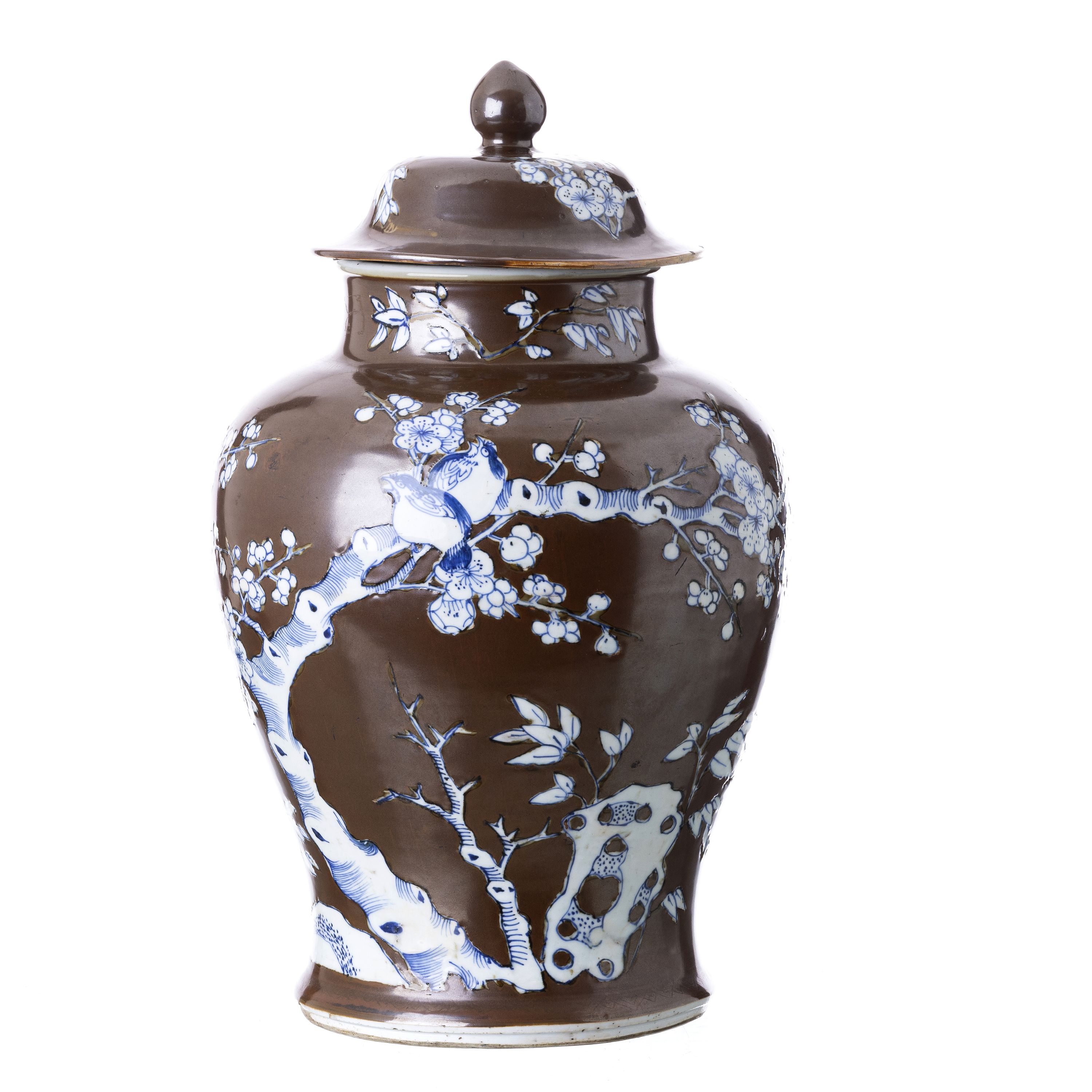 China, Kangxi, decoração a azul e branco com aves entre ramos de árvores em flor sobre fundo vidrado de chocolate. Pequenos defeitos. Dim.: 40,5 cm.