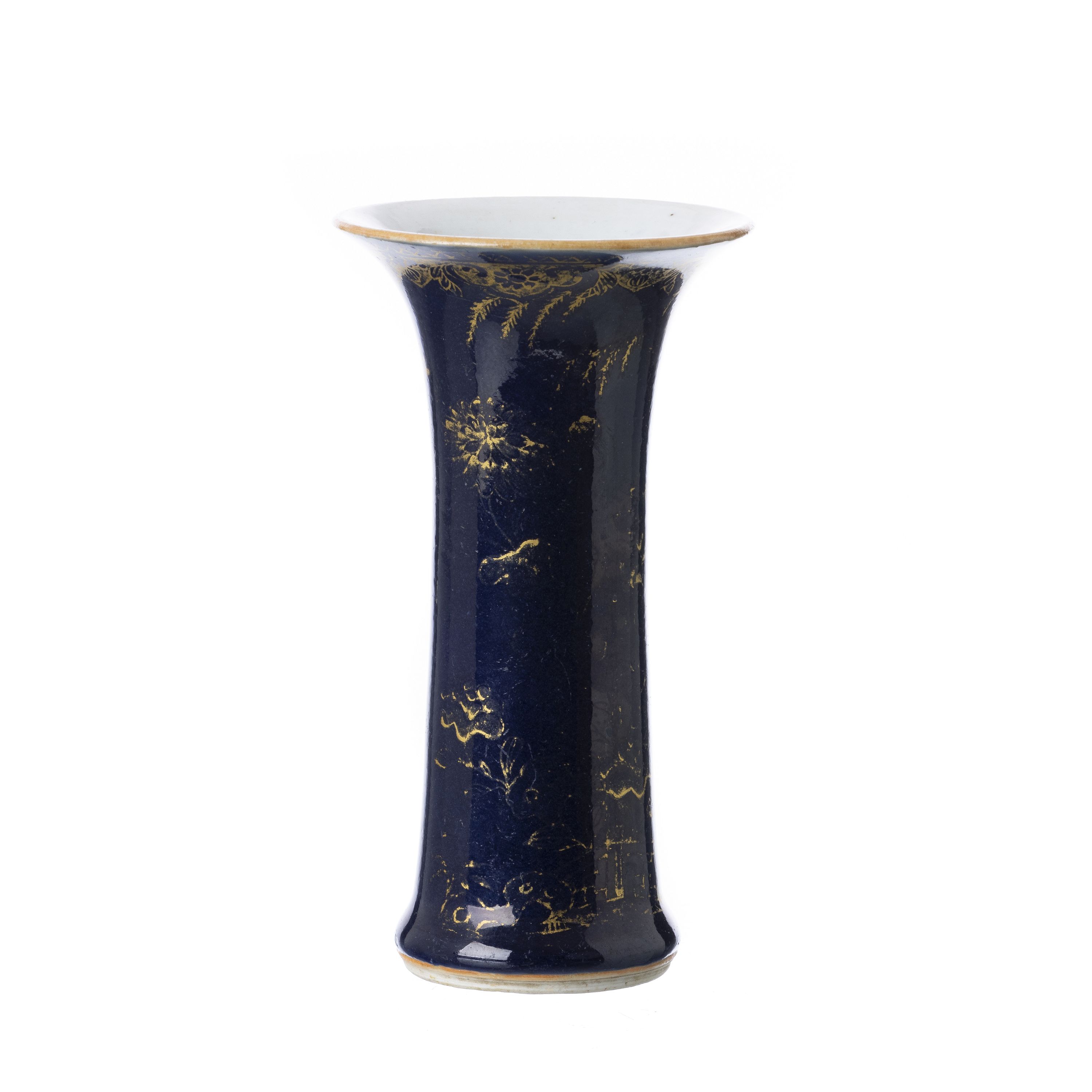 China, Kangxi, decoração a ouro sobre fundo powder blue representando flores. Desgaste. Dim.: 14 cm.
