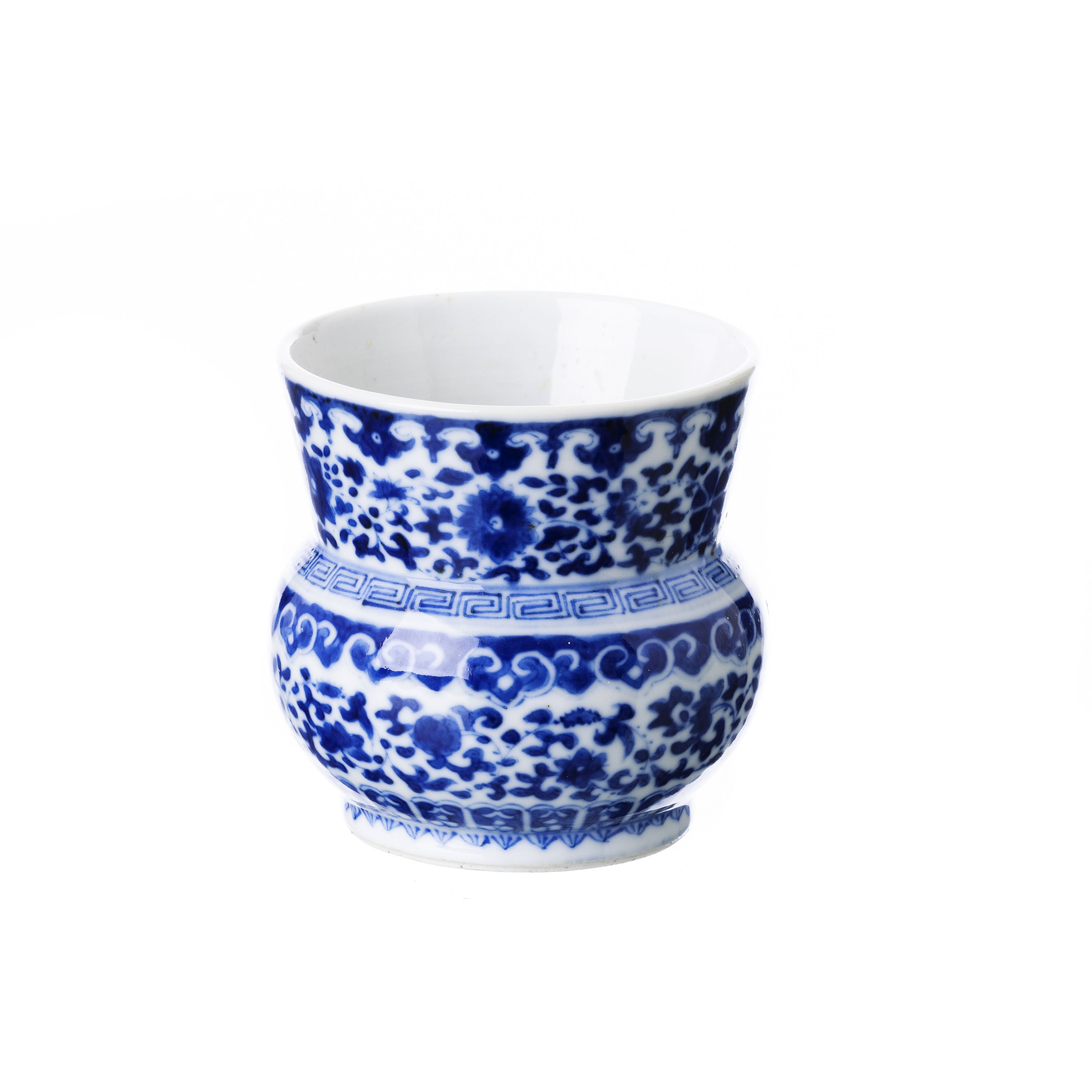 China, Daoguang, decoração a azul com enrolamentos vegetalistas. Marca apócrifa Qianlong na base. Dim.: 8 cm.
