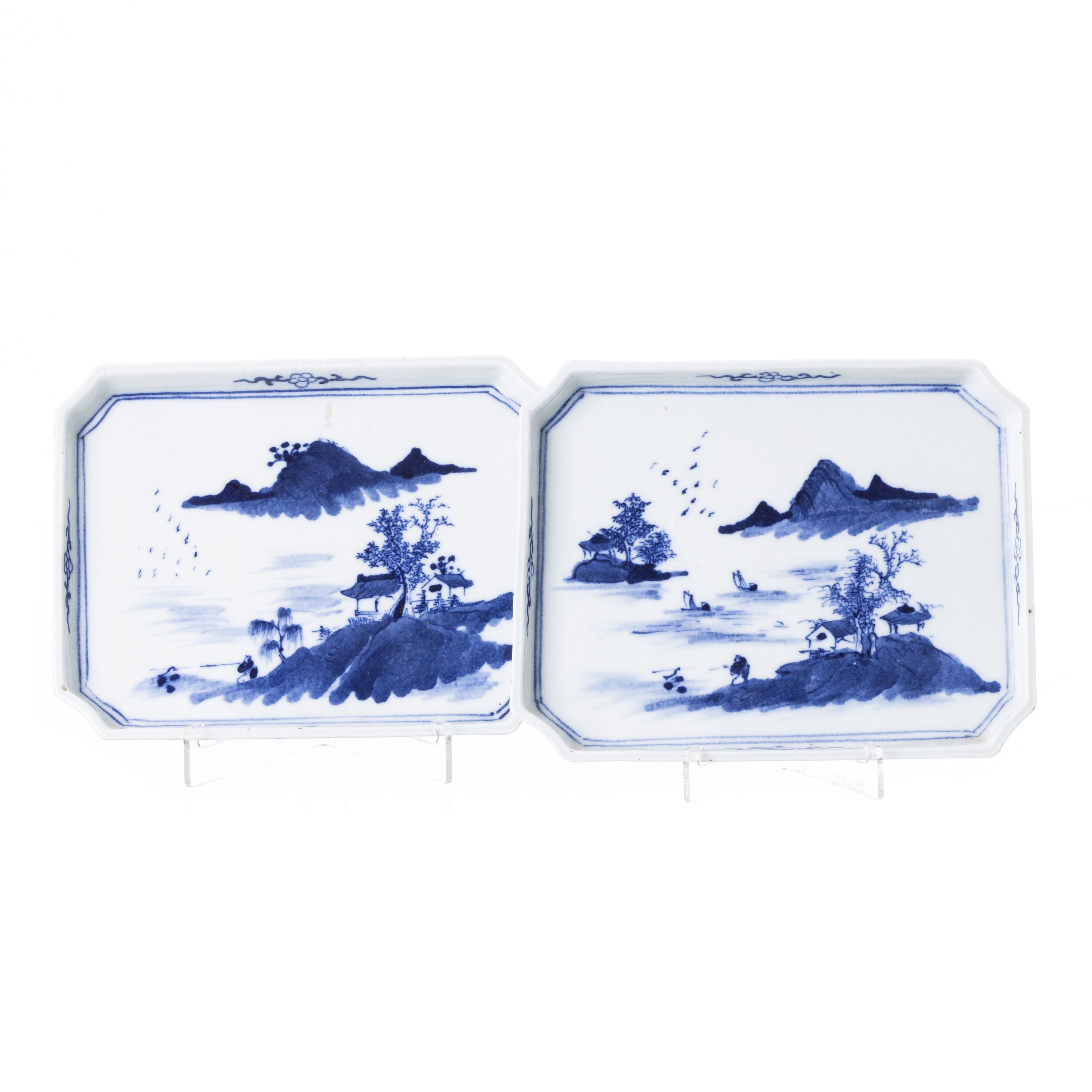 China, Minguo, oitavados com decoração a azul e branco, representando paisagem fluvial com pagodes e figuras. Sinais de uso. Dim.:23,5cm e 23,8cm.
