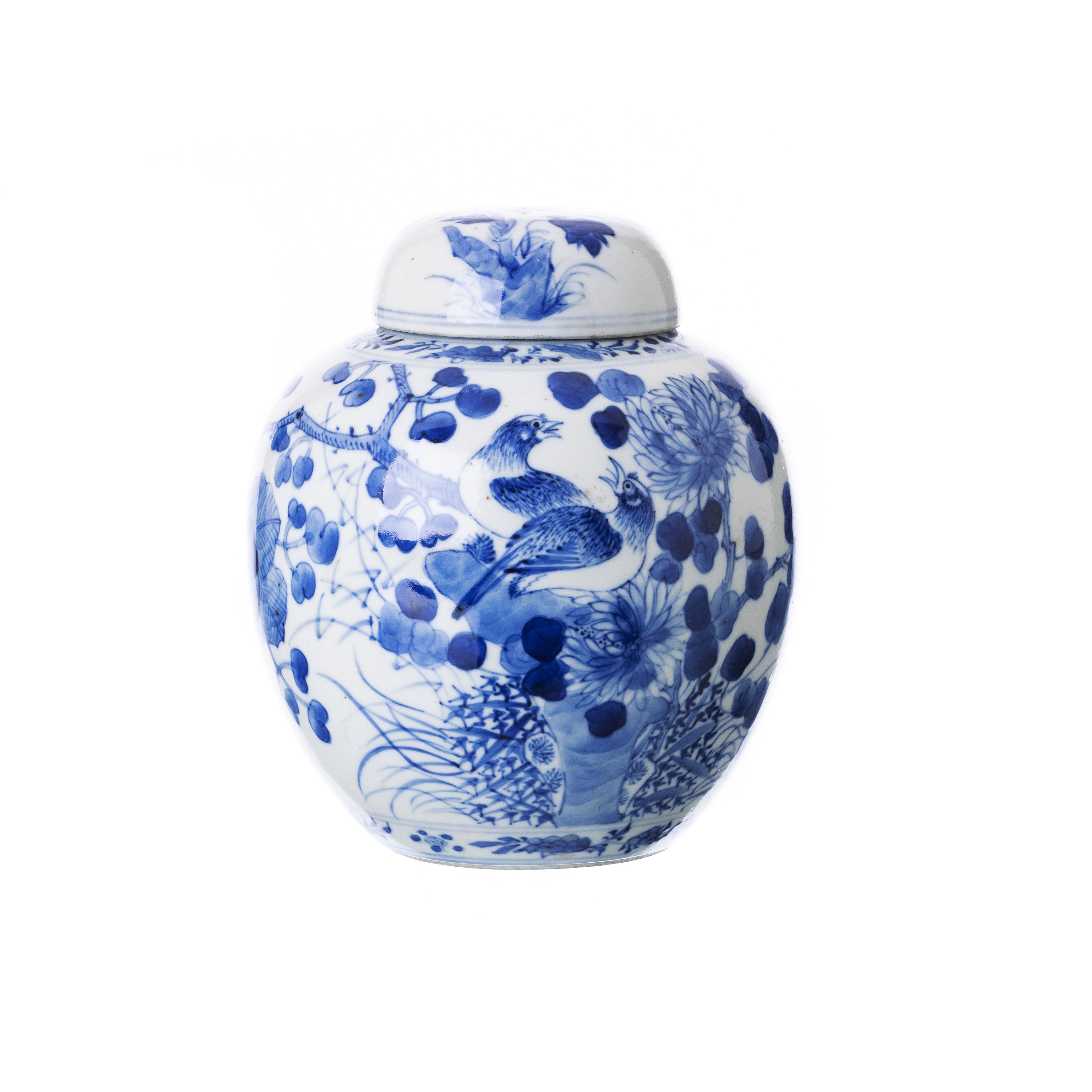 China, Tongzhi, decoração a azul e branco com aves e borboletasm entre ramos e flores. Marca na base. Sinais de uso. Dim.:15cm.