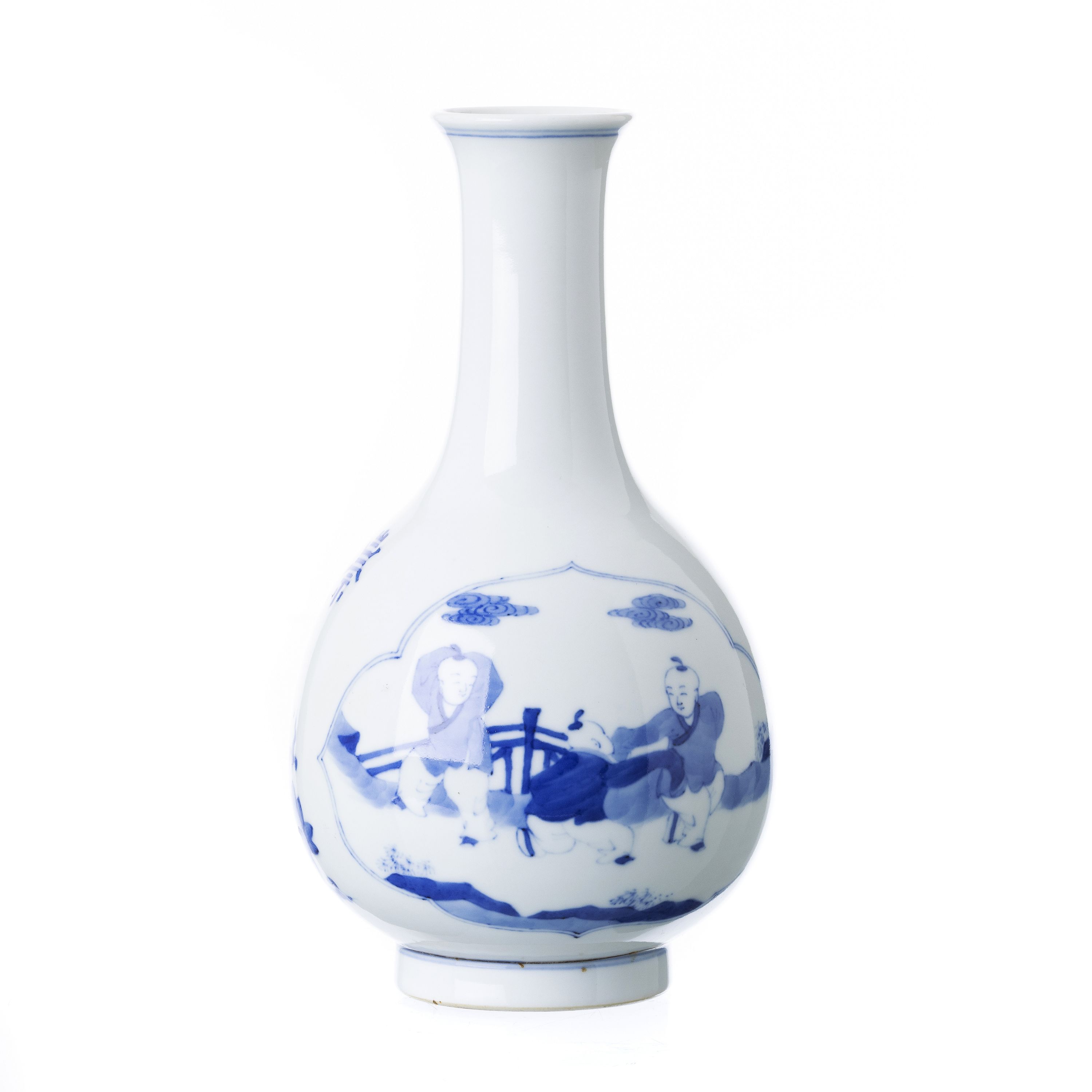 China, Minguo, decoração a azul e branco com reservas de meninos brincando em paisagem. Duplo circulo na base. Com cabelo em volta da base. Dim.:23cm.