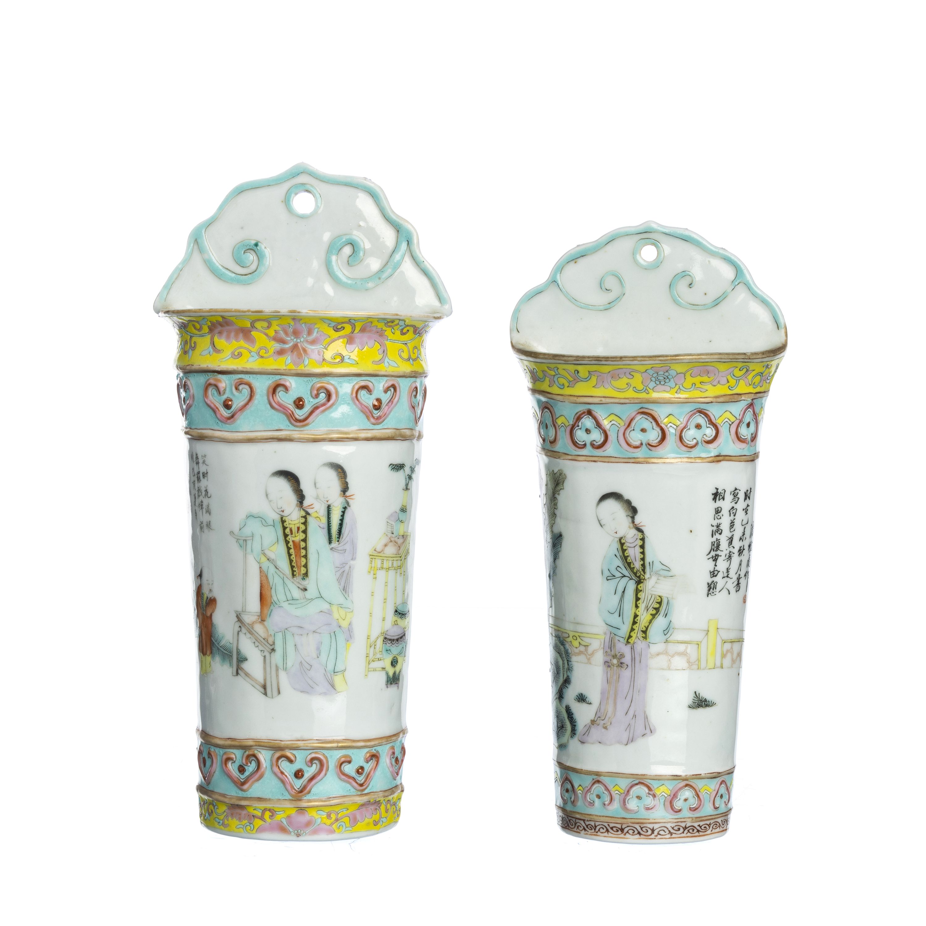 China, período Guangxu, decoração a esmaltes polícromos, representando figuras, caligrafia. Sinais de uso. Dim.: 22,5 e 24,5 cm.
