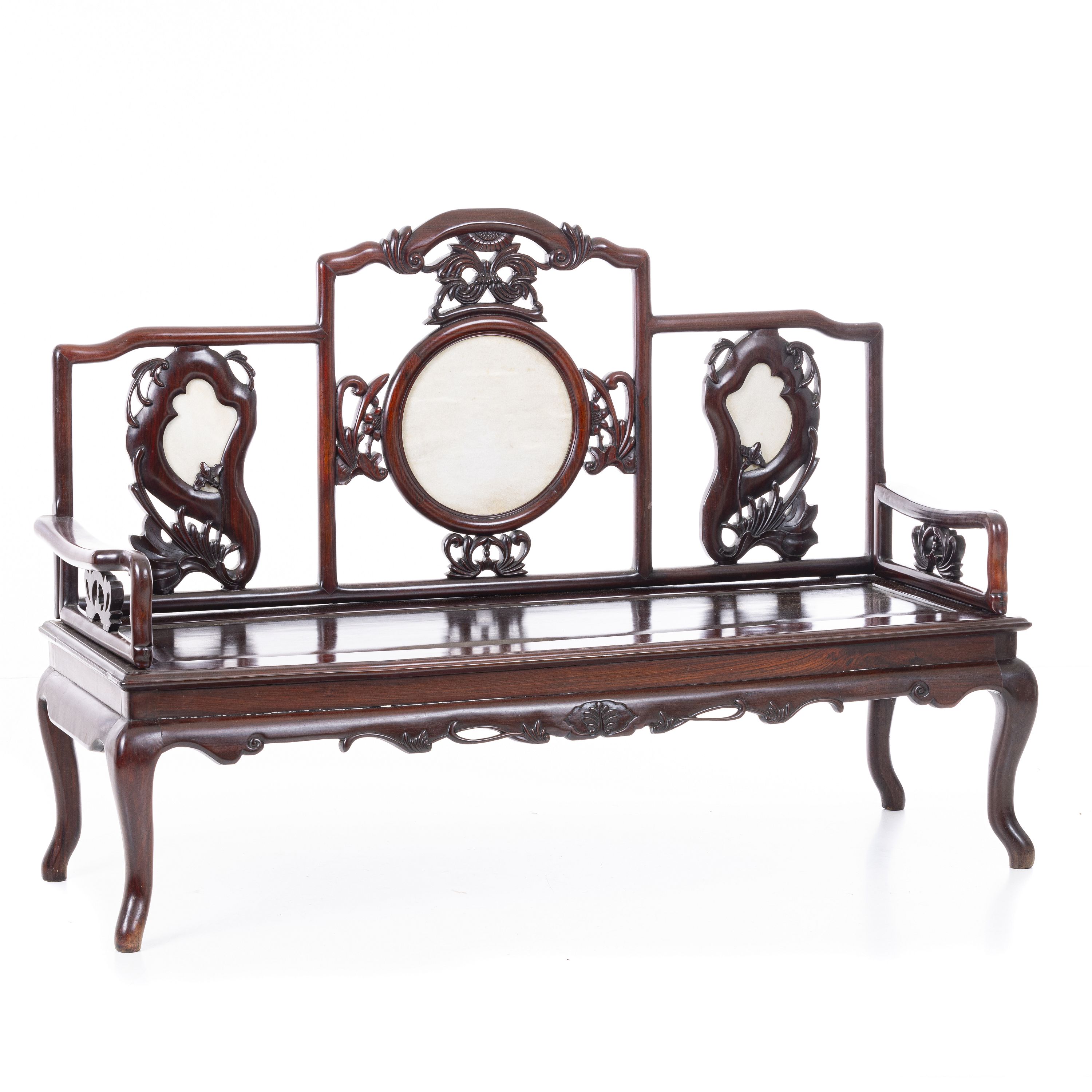 China, Minguo, em tamarindo entalhado, decoração vegetalista espaldar com placas em marmore. Sinais de uso. Dim.: 112x66x160 cm.
