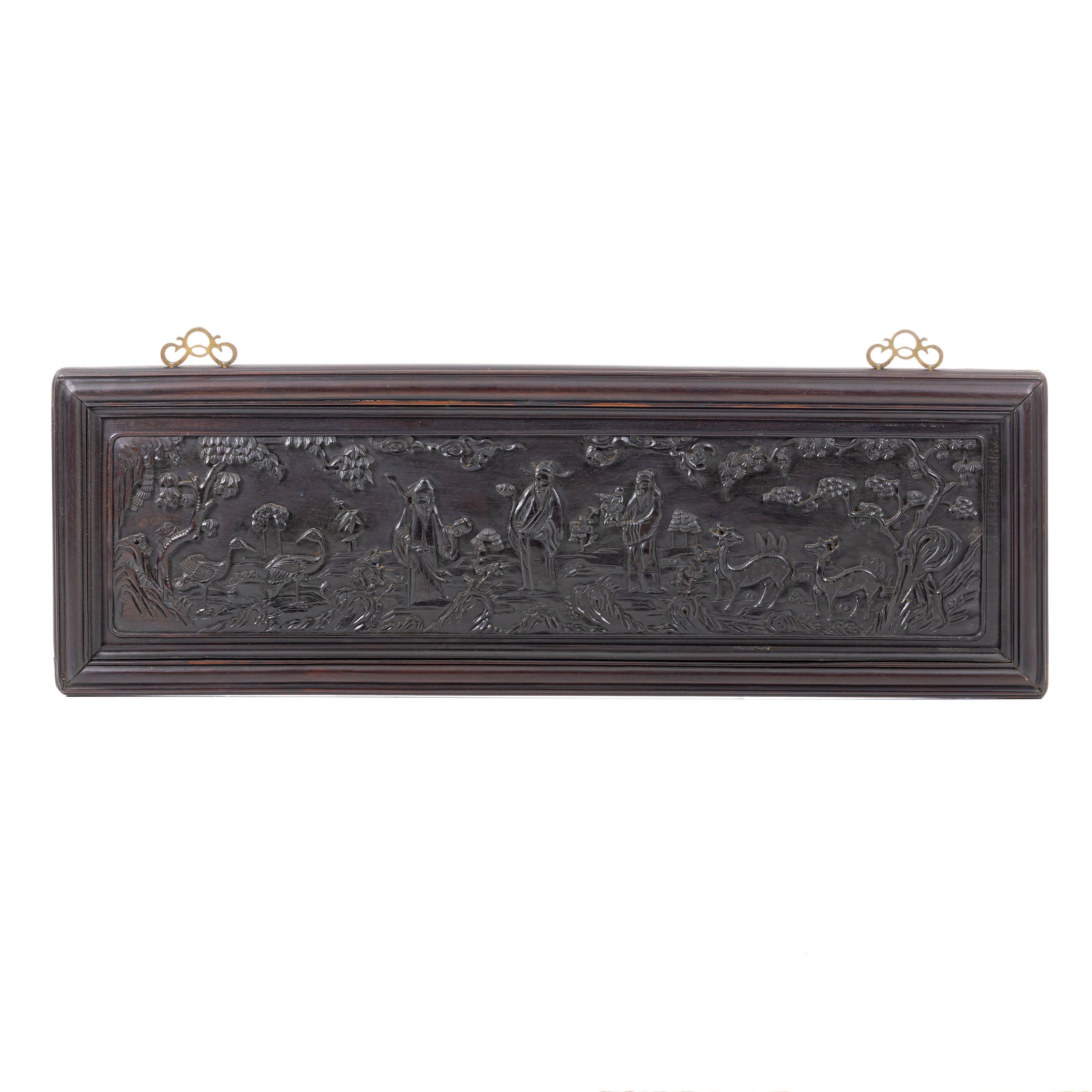 China, Minguo, placa em tamarindo entalhado com representação dos Deuses da Estrela, Fu, Lu, e Shou, figuras entre animais. Sinais de uso. Dim.: 43x130 cm.