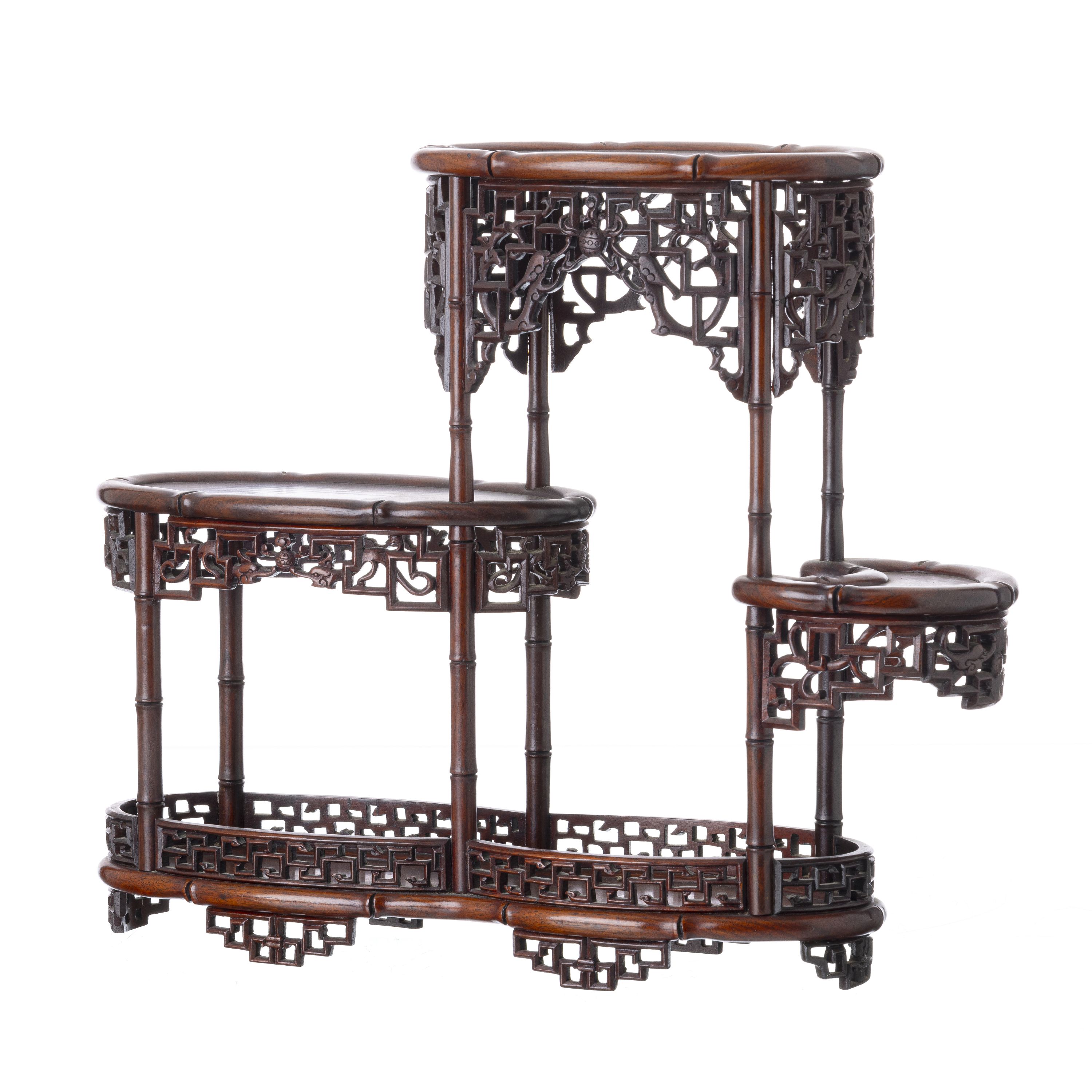 China,Minguo, em madeira exótica, decoração entalhada, de três andares. Sinais de uso. Dim.: 38x46 cm