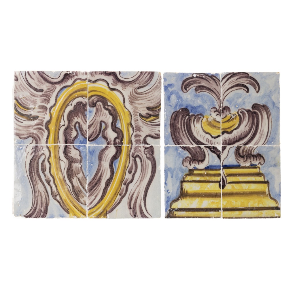 Portugueses, séc.XVIII, decoração vegetalista polícroma, paineis soltos compostos por 8 azulejos. Sinais de uso. Dim.:27,5x22cm e 27,5x27,5cm