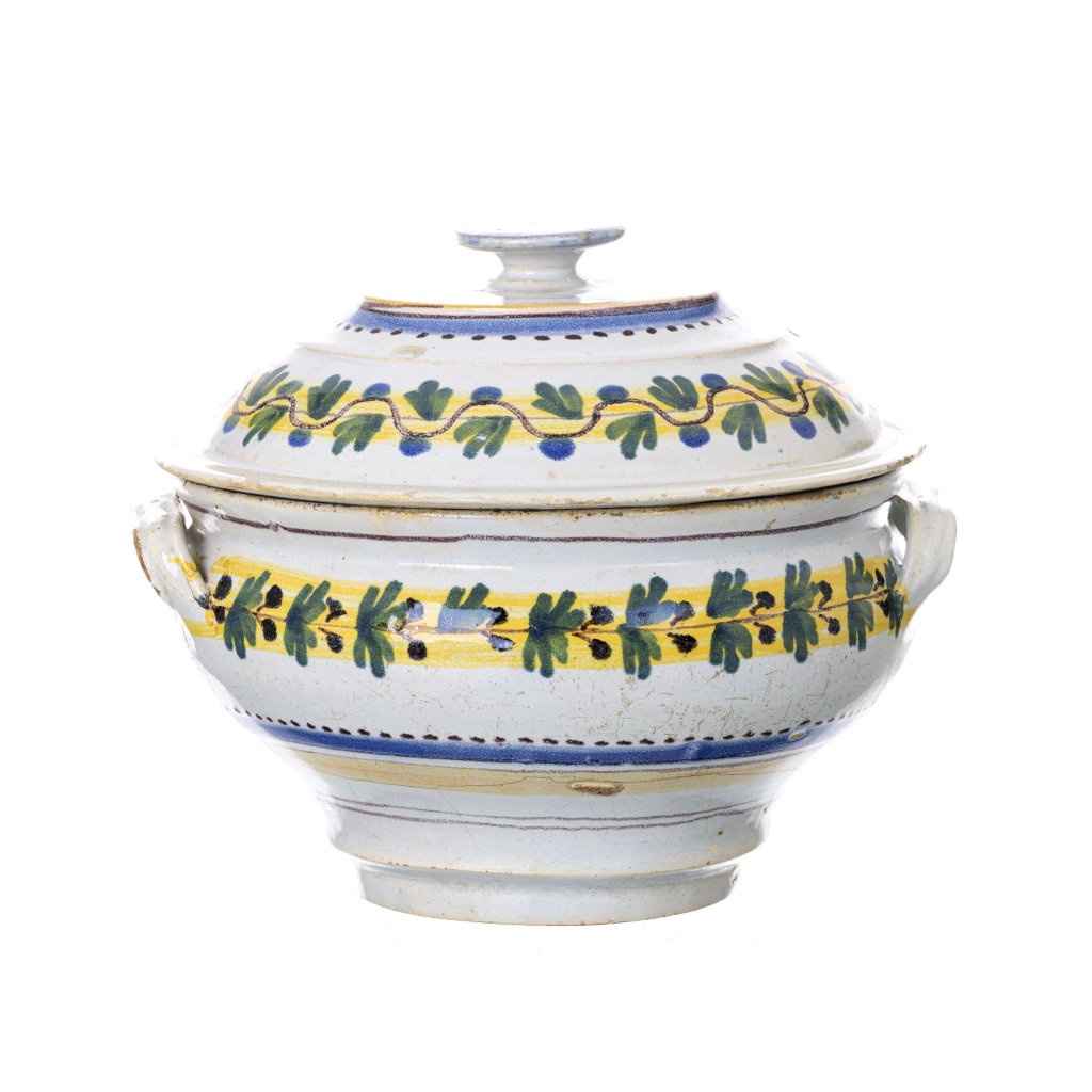 Faiança portuguesa atribuível a Estremoz, séc.XIX, decoração polícroma vegetalista. Cabelos, pequeno restauro na tampa. Dim.: 20 cm