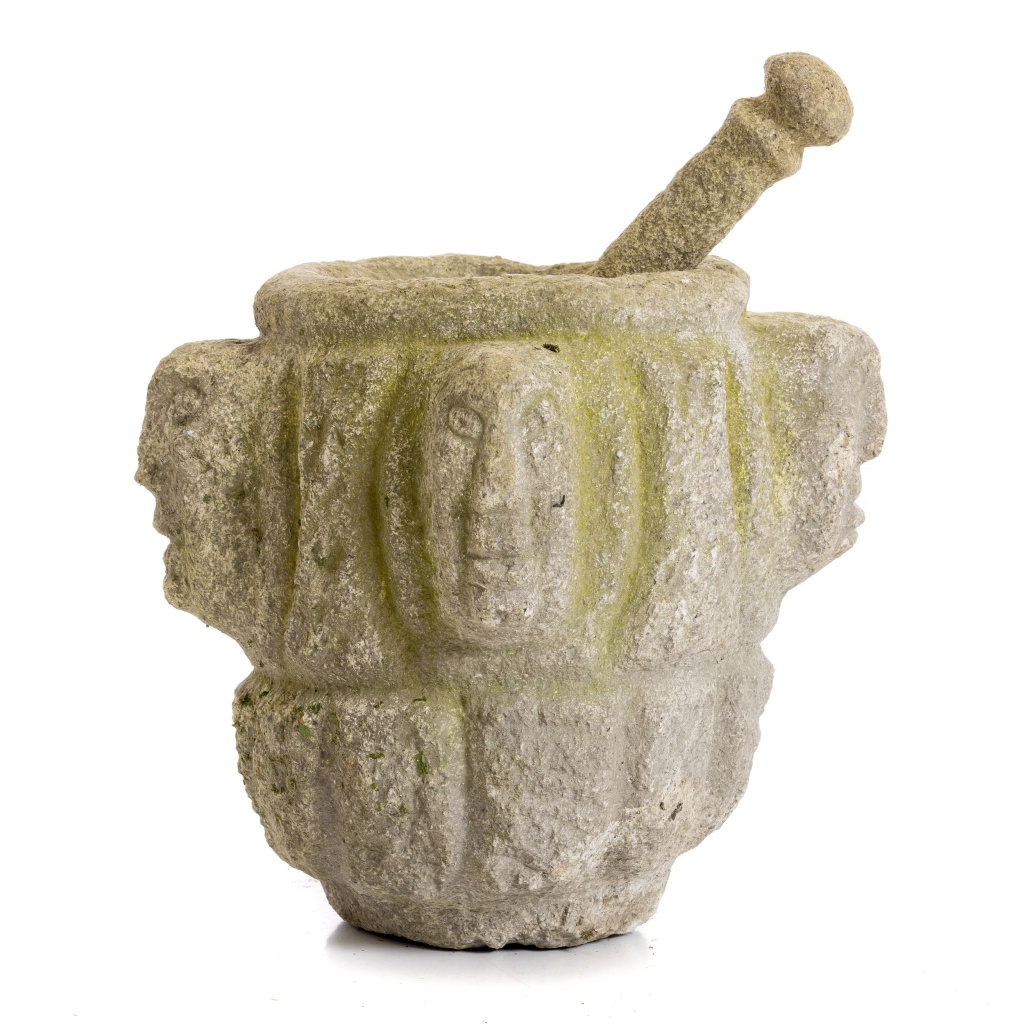 Portugal, séc. XIX/XX, esculpido em granito com carrancas laterais. Sinais de uso. Dim.:36x40 cm; mão 30 cm