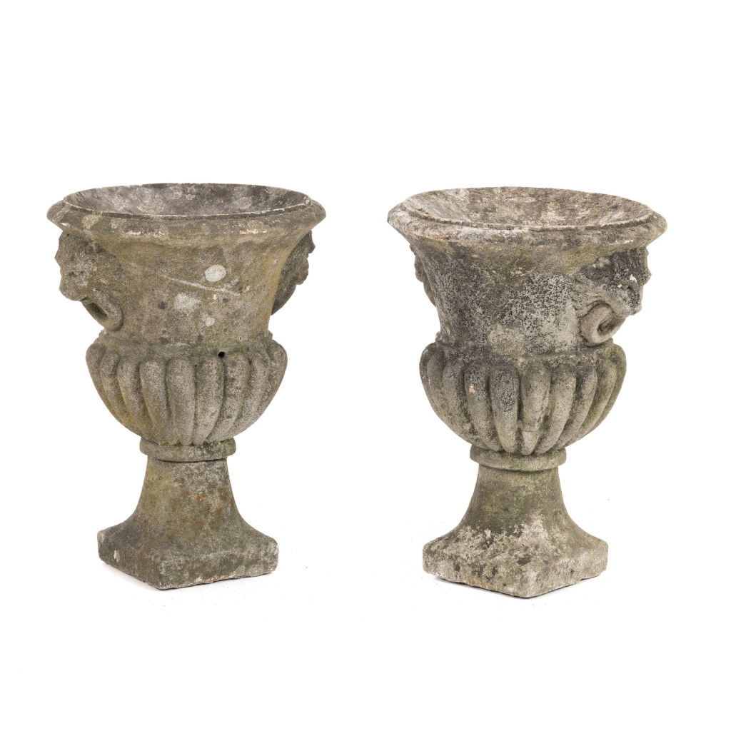 Portugal, séc.XVIII/XIX, ânforas esculpidas em granito, com asas laterais com forma de leões. Sinais de uso. Dim.: 51 cm.