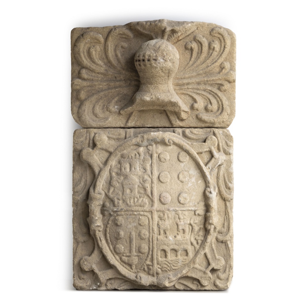 Portugal, séc.XVII/XVIII, granito esculpido, em duas partes, representando brasão de armas portuguesas, encimado por elmo e paquife. Sinais de uso. Dim.:138x86cm.
