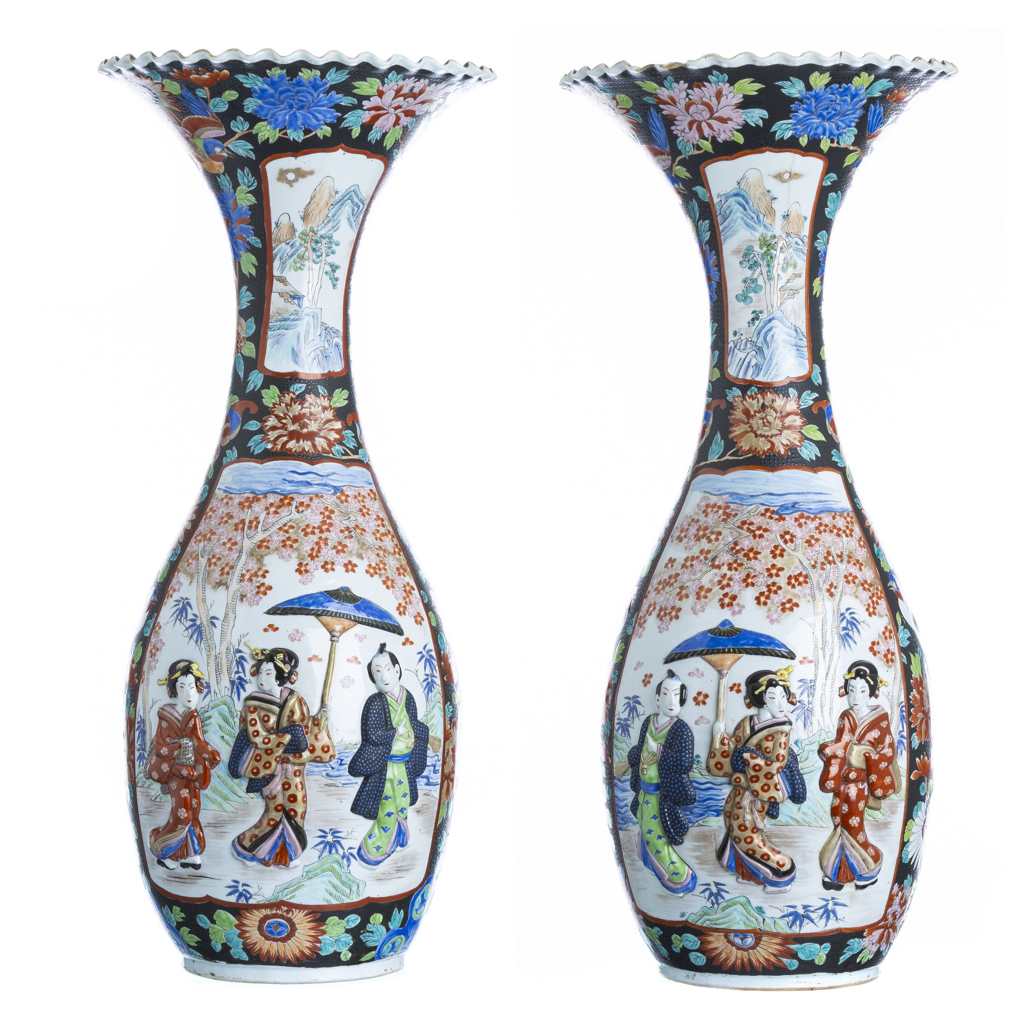 Japão, período Meiji, porcelana moldada, decoração relevada e polícroma com figuras em paisagem. Marcas nas bases. Um com defeito e cabelo no gargalo. Dim.: 83 cm.