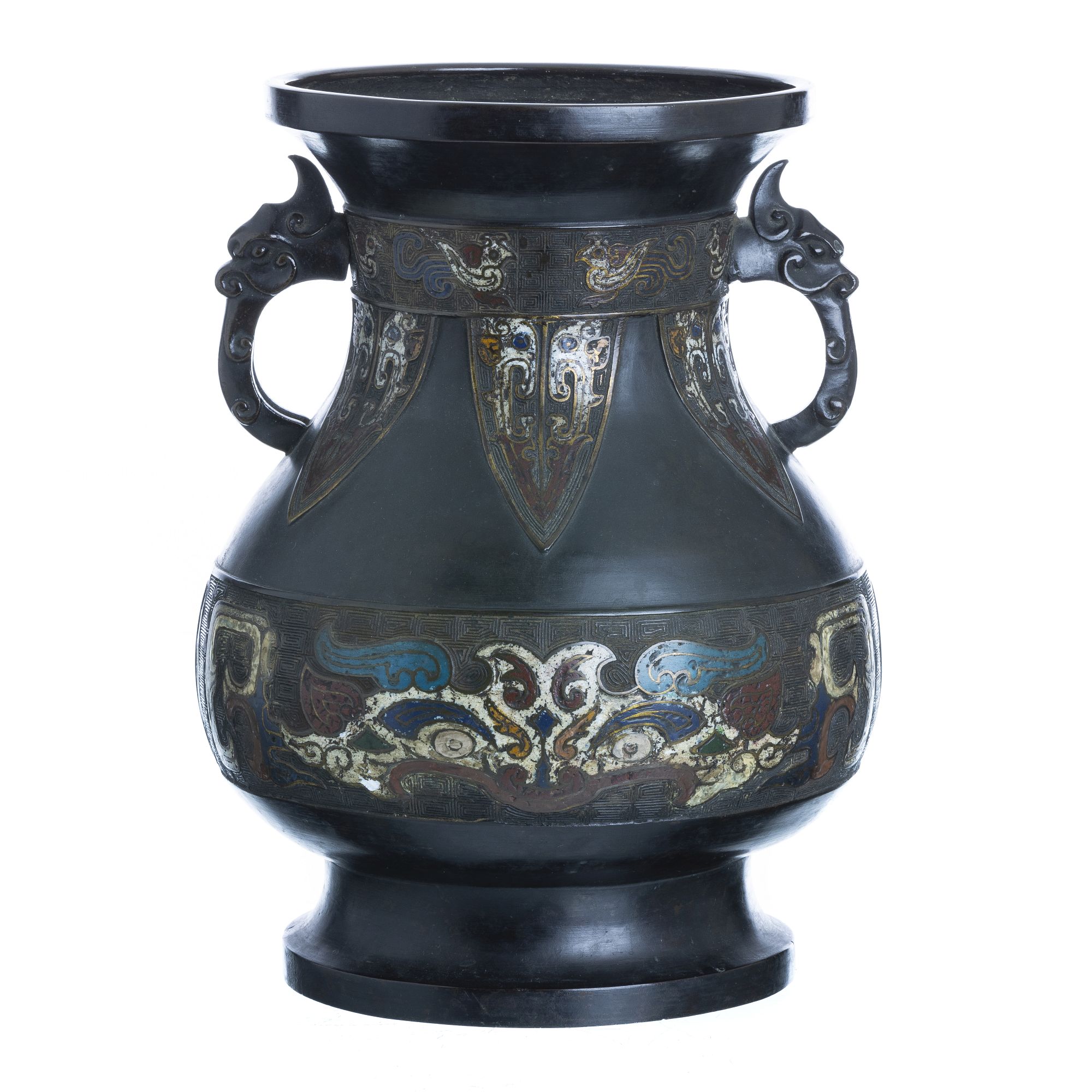 Japão, Meiji, em bronze patinado relevado, decoração arcaica polícroma de esmaltes cloisonné. Sinais de uso. Dim.: 31 cm.