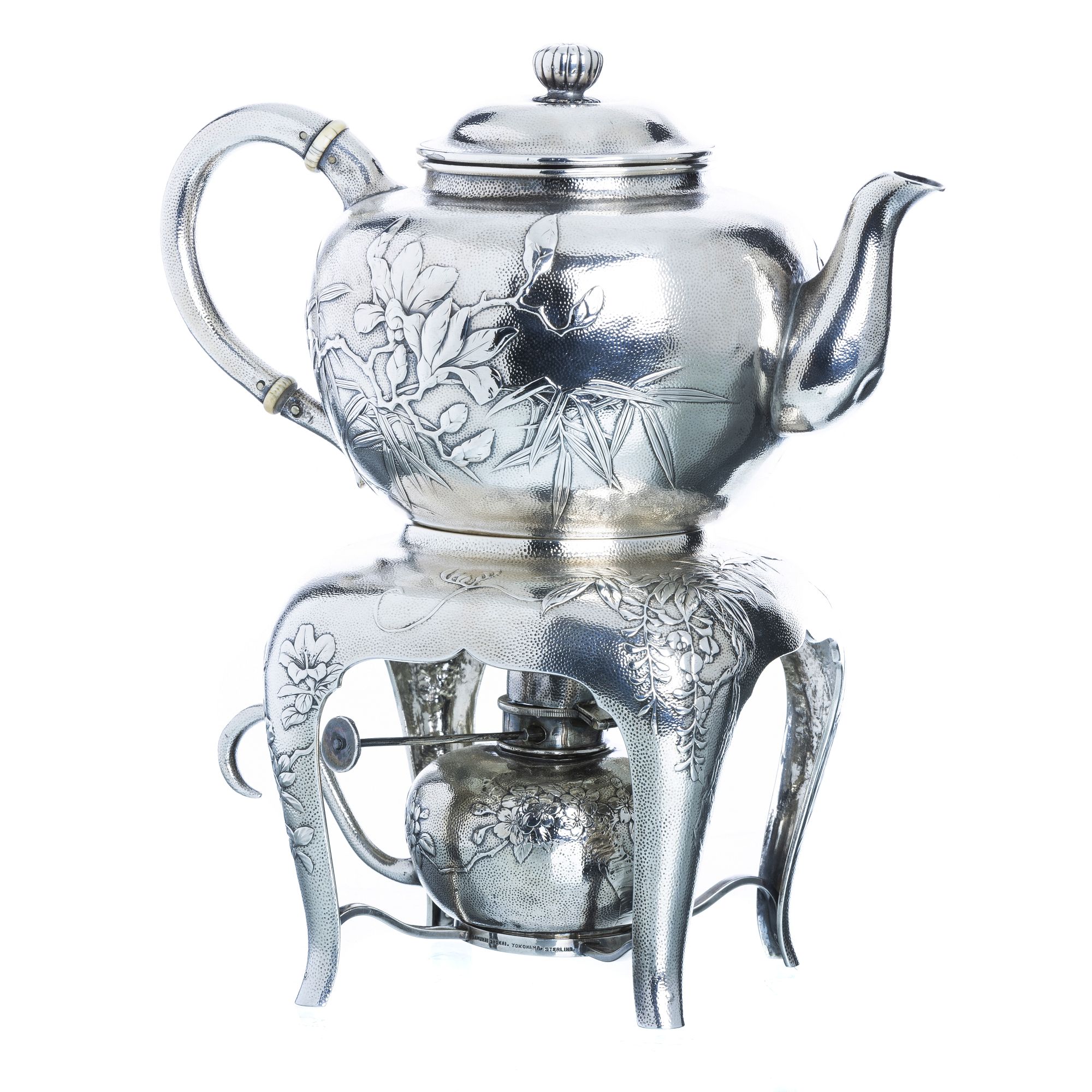 Prata Japonesa, c.1900, marcada 'Samurai Shokai Yokohama, sterling', decoração relevada de flores, lótus, bambú e ramos de ameixoeira. Pequenas amolgadelas na lamparina. Peso aprox.:1186g. Dim.:25cm.