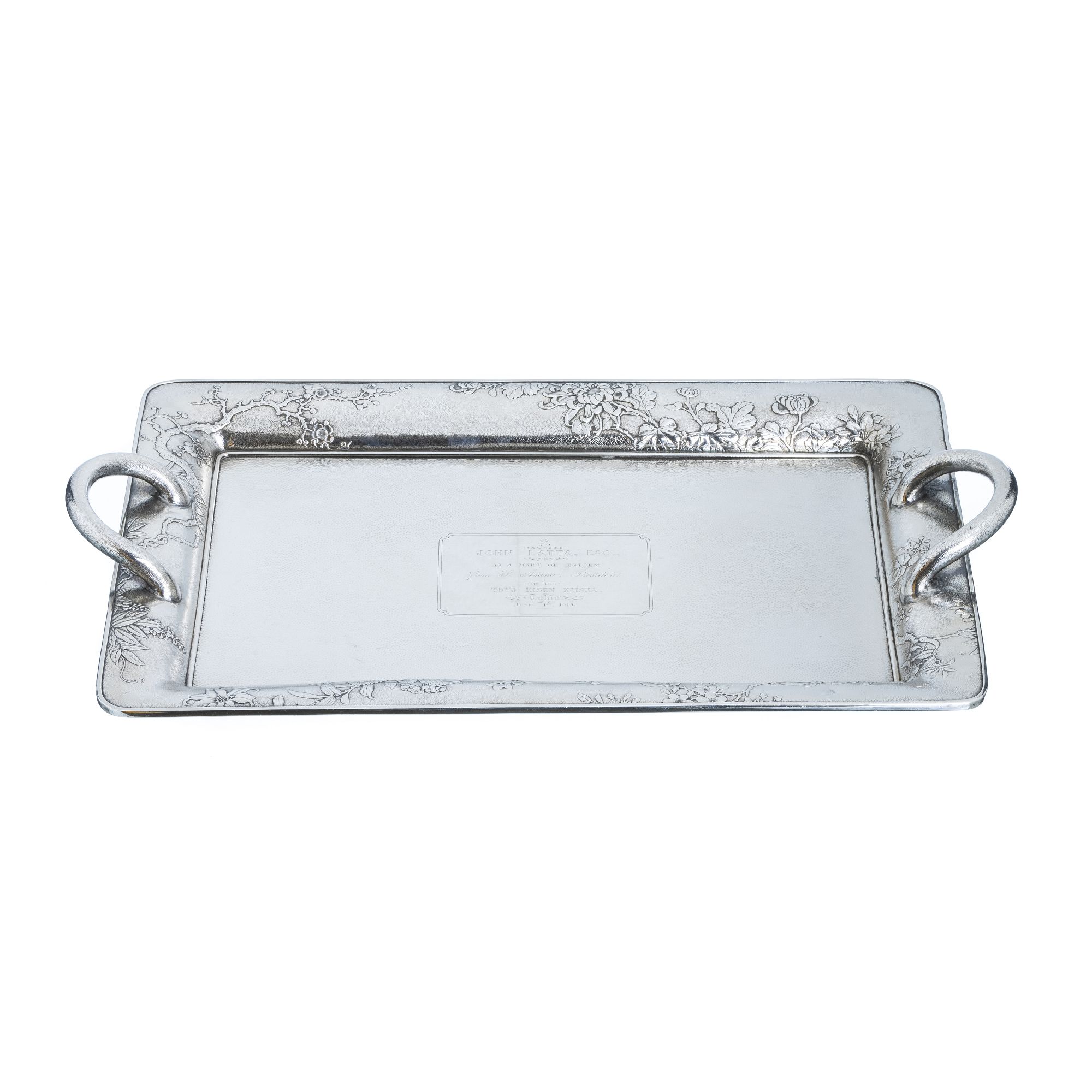 Prata Japonesa, marcada 'Samurai Shokai Yokohama, sterling', decoração relevada com flores, inscrição 'To John Latta, Esq. as a mark of esteem, from S. Asano, President of the Tokyo Kisen Kaisha, Tokio, June 1st,1914'. Peso aprox.:4140g. Dim.:67cm.