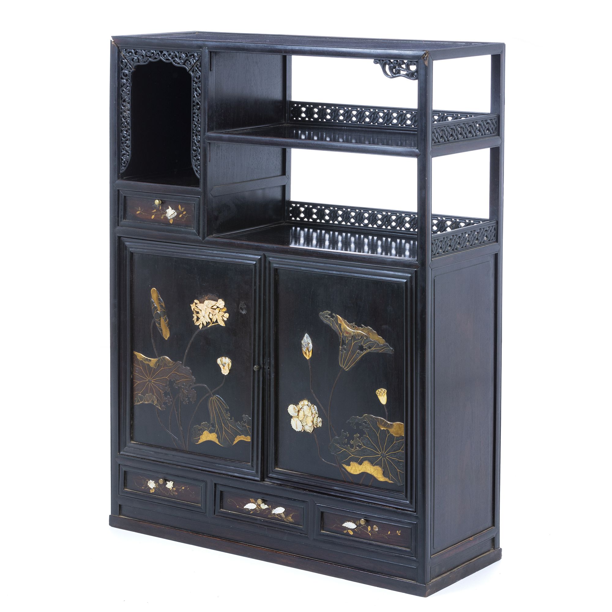 Japão, Meiji, móvel estante em madeira exótica, decoração policroma com embutidos em pedra dura e osso. Sinais de uso, faltas e defeitos. Dim.: 118x87,5x31 cm.