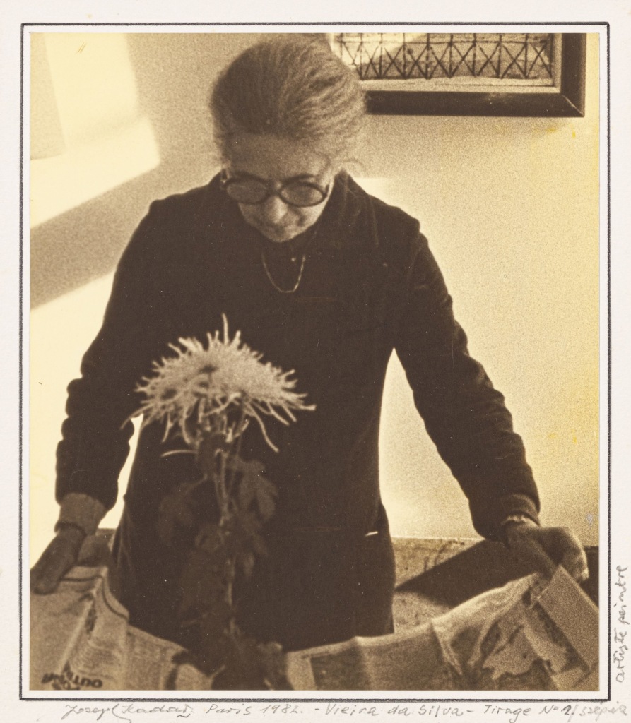 Fotografia colada sobre papel, assinada e datada de Paris, 1982, inscrição: 'Vieira da Silva, artiste peintre'. Dim.:22,5x19,5cm