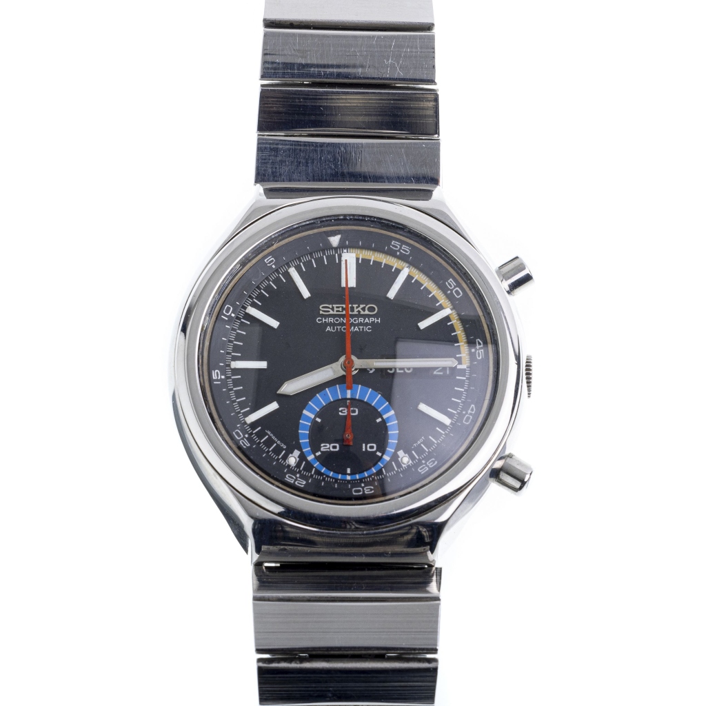 Japão, c.1976, aço, movimento mecânico automático, cronografo, 6139-7060, blue eye, sunrise dial, ref.500101, mostrador preto, resistente à água. Marcado. Sinais uso. Dim.mostrador:4cm.