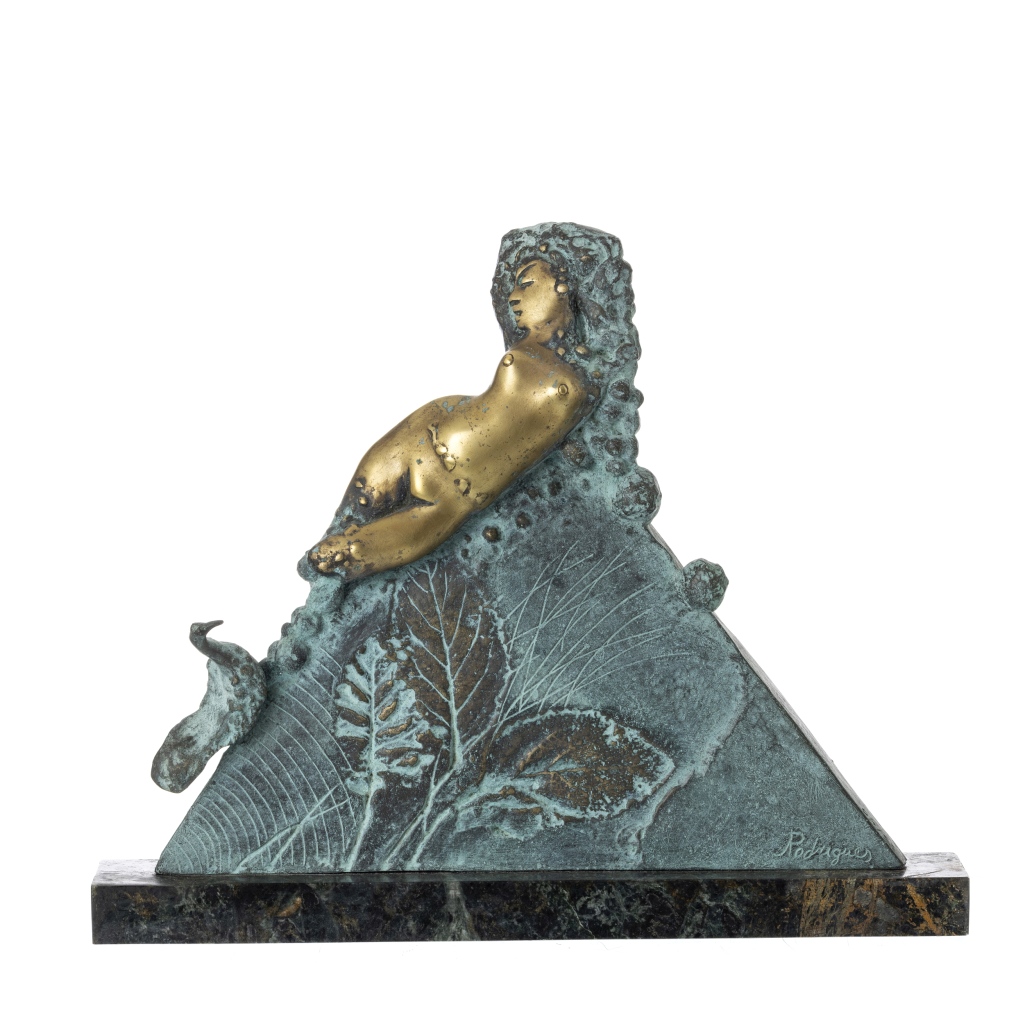 Escultura em bronze patinado, representando nú feminino assente em forma triangular com pavão e folhagem, numerada 15/40, assinada. Dim: 42x35cm.