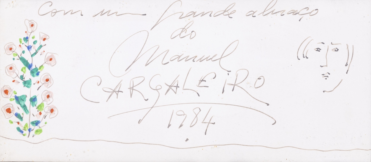 Técnica mista sobre verso de cartaz de exposição do autor, com dedicatória, assinada e datada de 1984. Dim.:11x26cm
