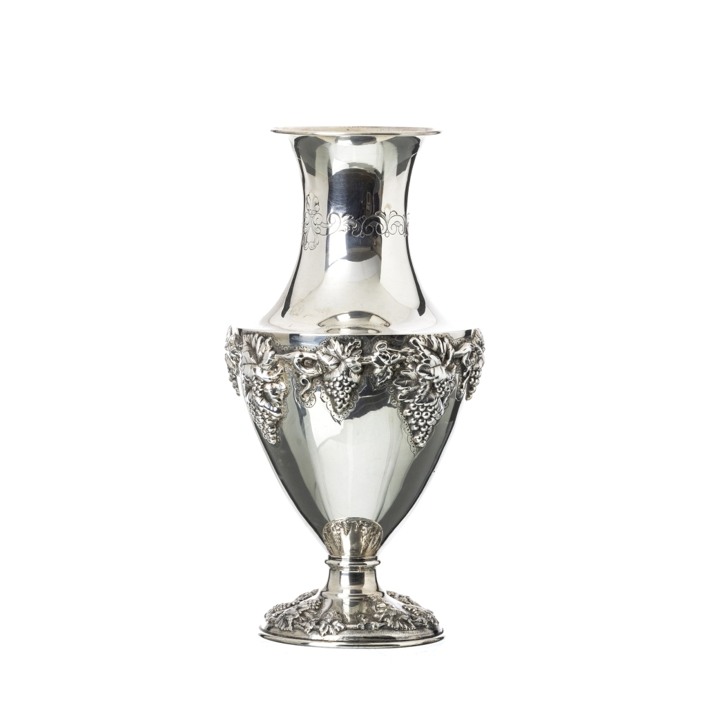 Prata portuguesa, contraste águia 916 (1938-1984), decoração relevada com uvas e parras de uva, gargalo com decoração incisa vegetalista. Peso aprox.:757,6gr. Dim.:32 cm